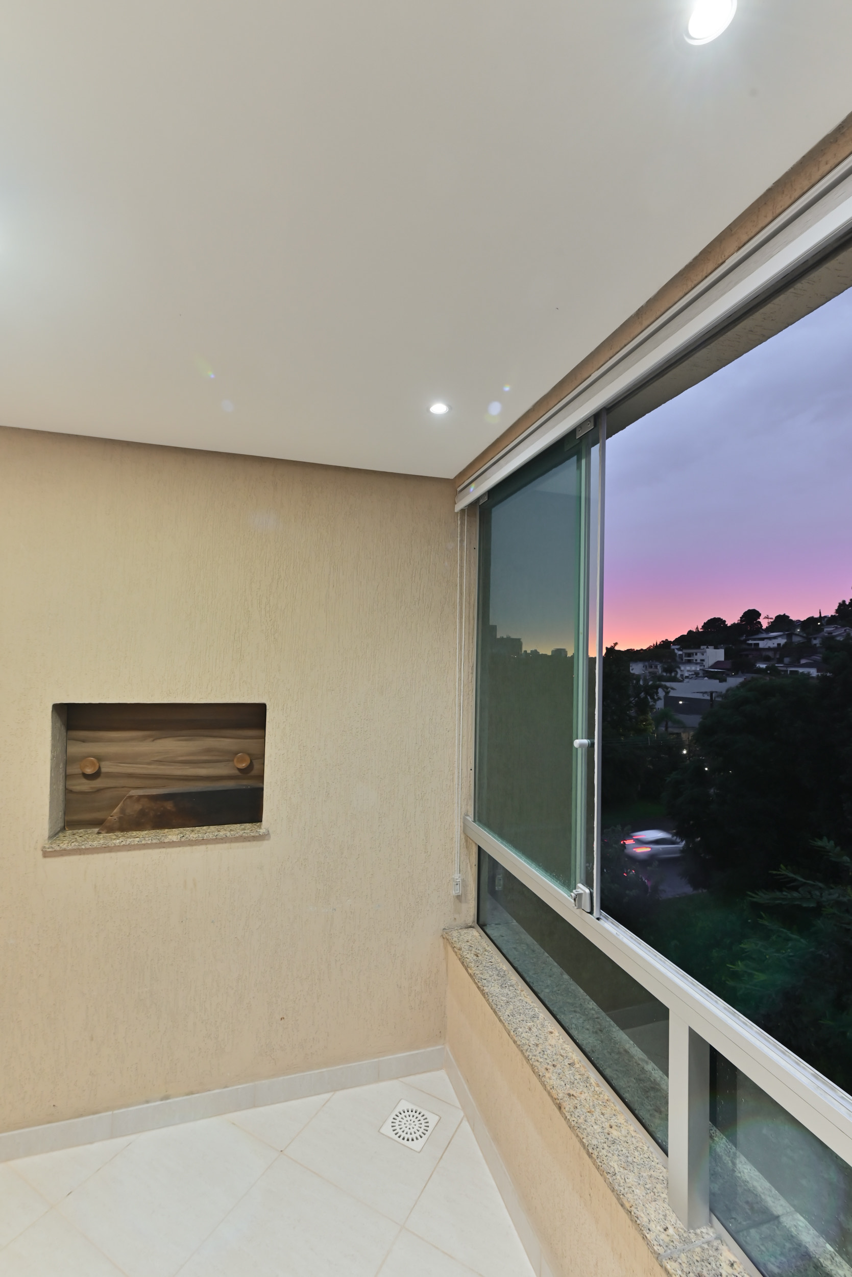 A sacada é um capítulo à parte. Ampla, separada, com churrasqueira e pia de apoio, perfeita para receber, ou simplesmente para abrir um vinho no fim do dia e assistir ao pôr do sol entre a copa das árvores. Uma vista que acalma. Um refúgio no meio da cidade.